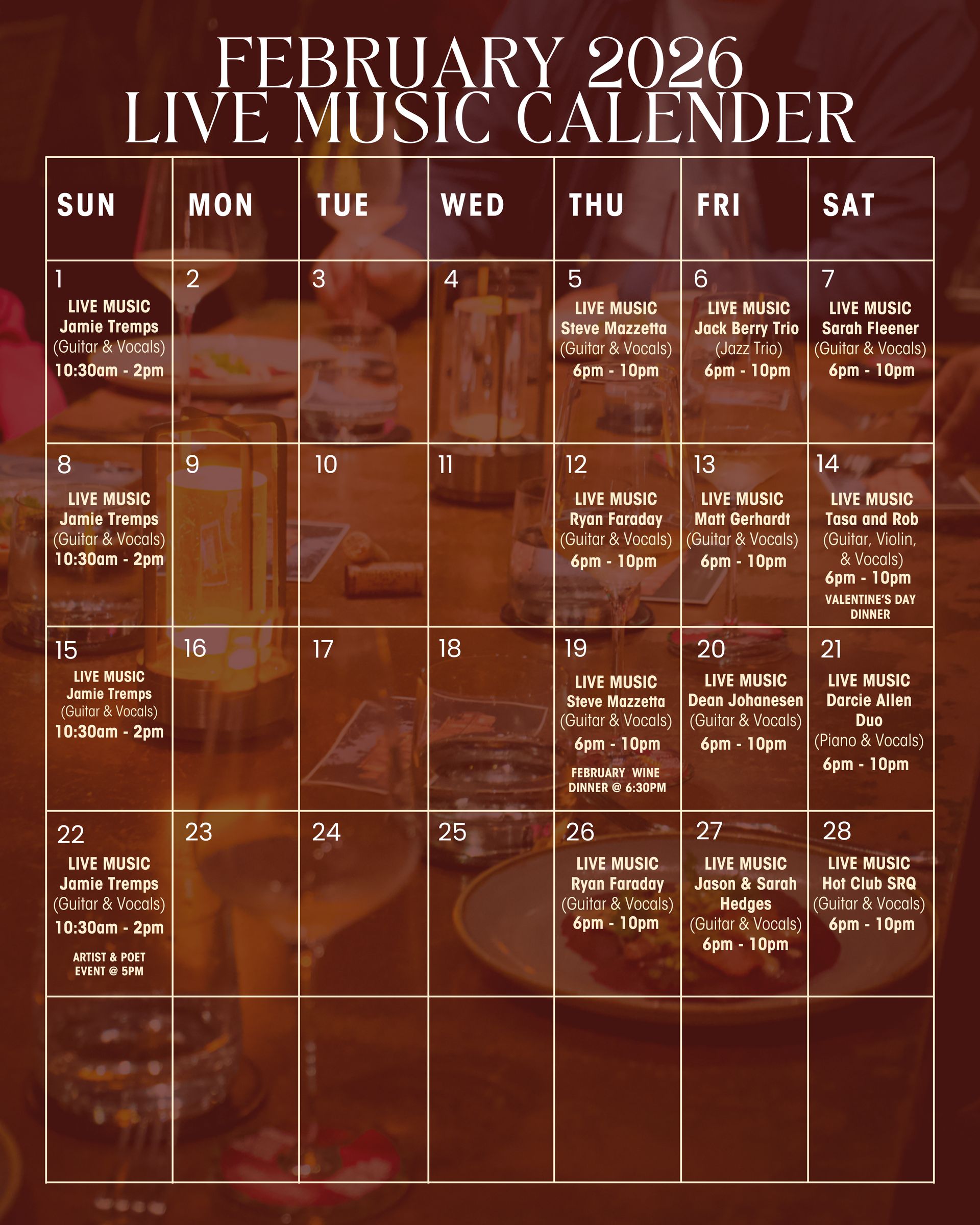 Sweathearts Wine Dinner: Fall in love with February flavors at our Sweethearts Wine Dinner, a four-course paired dining experience celebrating romance and exceptional craftsmanship. Each course is thoughtfully curated and expertly paired with acclaimed wines from Paul Hobbs Winery, highlighting a world-class approach to balance, elegance, and terroir-driven flavor. From the first sip to the final course, enjoy a seamless harmony of inspired cuisine and renowned wines—an intimate evening designed to be shared with someone special!